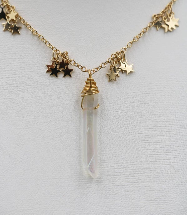 Gold plated star dripping chain met Angel aura quartz.