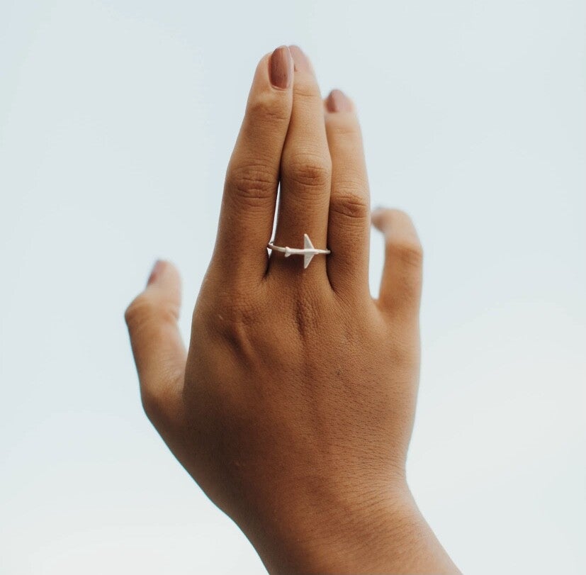 Wanderlust Ring Silver plated ring. Vliegtuig charm op de ring. Ring maat 18. Gemaakt in Bali. Eco friendly